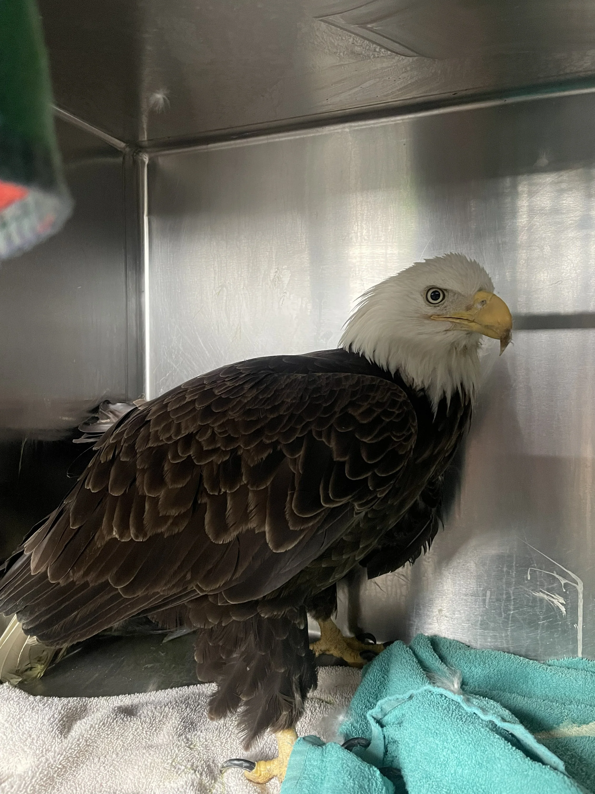 Why was this eagle poisoned? In his X-ray, there were no physical heavy metals noticeable, such as bullet fragments, so we’re not sure how he ended up with lead poisoning. The most common causes are being shot with lead ammunition or consuming lead fishing gear or fish that consumed lead fishing gear.